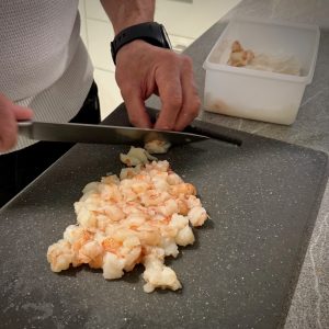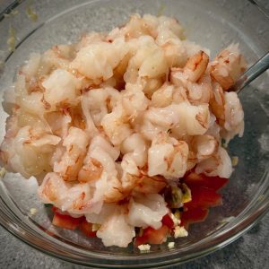 Coupez les gambas en tranches dans la longueur, environ 1/2 cm d épaisseur.Ajoutez les dans le saladier.