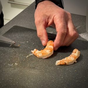 Décortiquez les gambas.PS : vous pouvez garder les têtes pour faire une bisqueCoupez l’arrête centrale (le dos) et ôtez les viscères.Rincez les, puis déposez les sur du sopalin pour les écouter correctement
