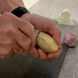 Pelez le gingembre en grattant l'écorce avec une cuillère.