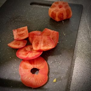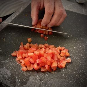 Lavez la tomate puis coupez la chair sans la pulpe en petits dés.PS : la pulpe peut être utilisée dans un bouillon ou autre.