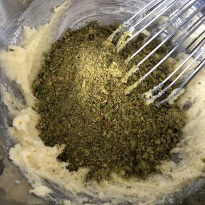 Ajoutez le sucre glace, la poudre de pistache. Mélangez.