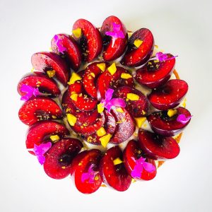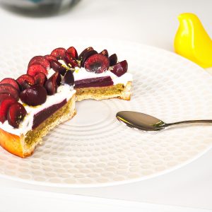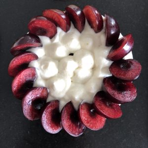 Formez une rosace avec les demi-cerises en commençant par l'extérieur. PS : si vous le souhaitez vous pouvez napper les faces coupées de vos cerises pour apporter plus de brillance. Pour cela, faites utilisez une compote de cerises (si besoin diluez-la avec un peu d'eau pour la fluidifier) et nappez vos fruits avec un pinceau. Si vous utilisez du miel, mettez le avec un peu d'eau au micro-ondes pour le rendre liquide.
