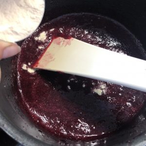Incorporez la pectine préalablement mélangée avec un peu de sucre. Laissez cuire 2 minutes à ébullition pour activer la pectine, sans cesser de fouetter.